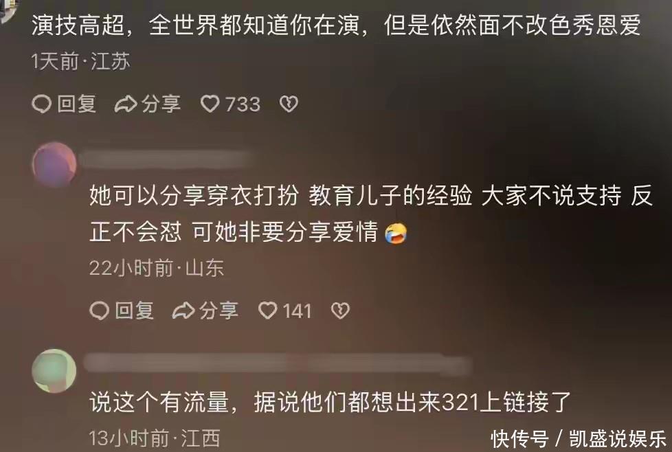 只不过她的这种秀恩爱却几乎没有得到观众的认可,反而换来的是各种嘲讽,觉得她刻意打造恩爱的人设就是为了捞金这两人现在的感情现状到底是怎样的?难道真的只是为了金钱强行来秀恩爱吗?